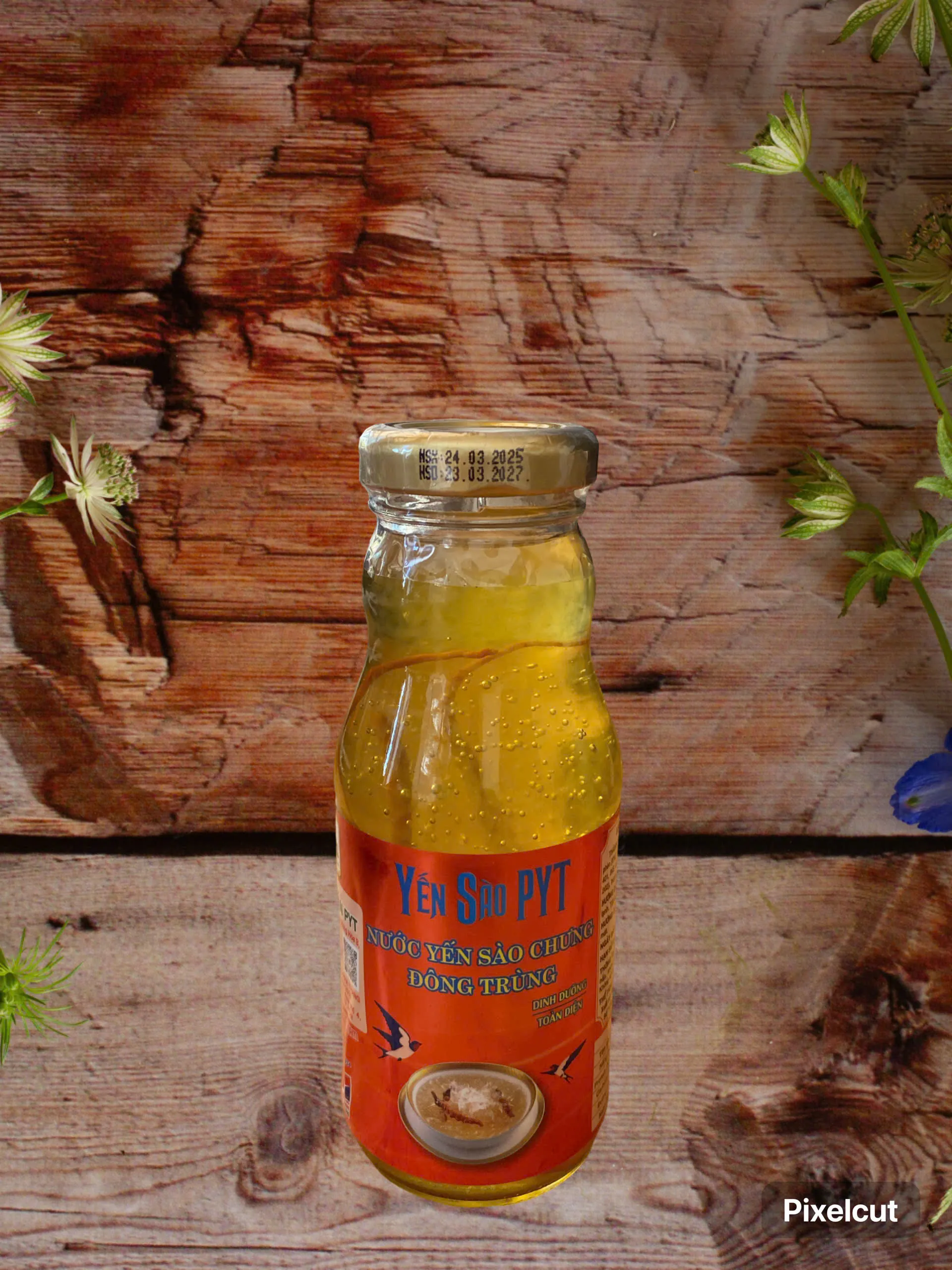 Thành phần: nước, yến sào tươi ngâm nở (60 mg), đường phèn (6%), sợi nấm trùng thảo (1200mg), chất làm dày (INS 327, INS 401, INS 406), chất ổn định (INS 415, INS 418), chất bảo quản (INS 202), hương yến tổng hợp.