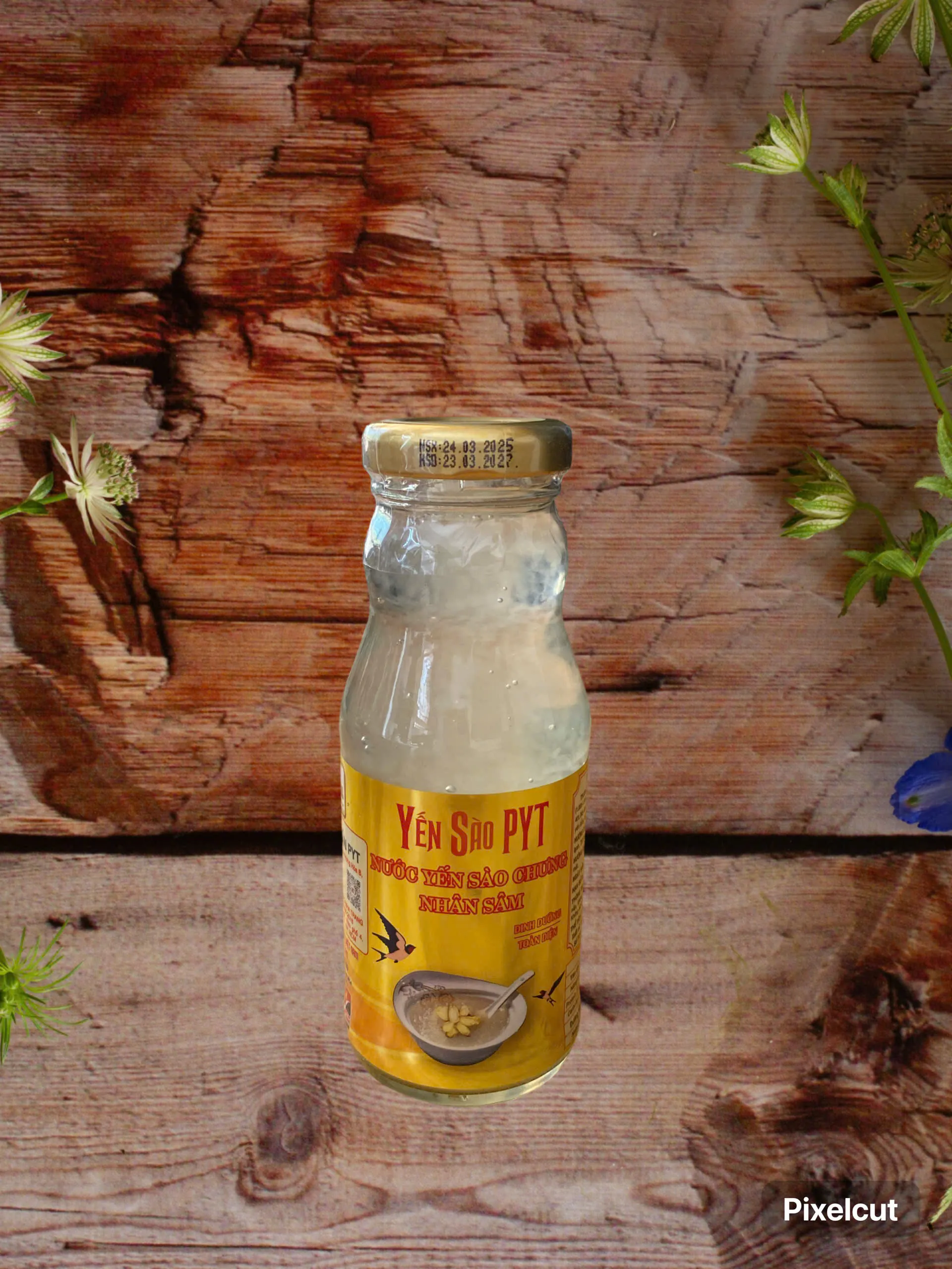 Thành phần: nước, đường phèn (6%), hồng đẳng sâm lát tươi (1.000-1.500 mg), yến sào tươi ngâm nở (60 mg), chất làm dày (INS 327, INS 401, INS 406), chất ổn định (INS 415, INS 418), chất bảo quản (INS 202), hương yến tổng hợp.